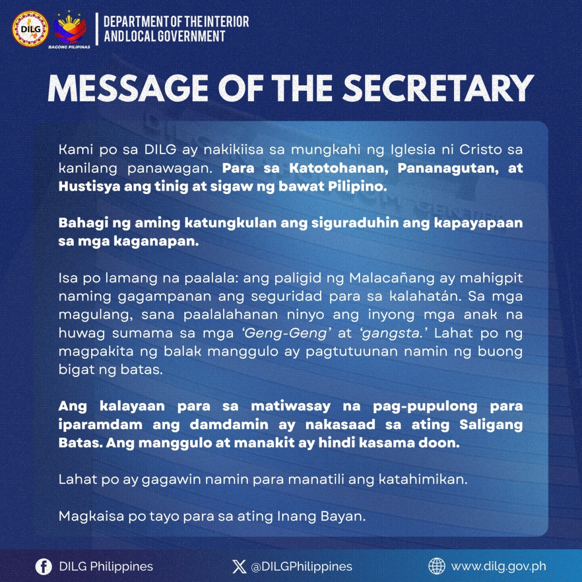 “Kami po sa DILG ay nakikiisa sa mungkahi ng Iglesia ni Cristo sa kanilang panawagan. Para sa Katotohanan, Pananagutan, at Hustisya ang tinig at sigaw ng bawat Pilipino. Bahagi ng aming katungkulan ang siguraduhin ang kapayapaan sa mga kaganapan,” panimula ng DILG.