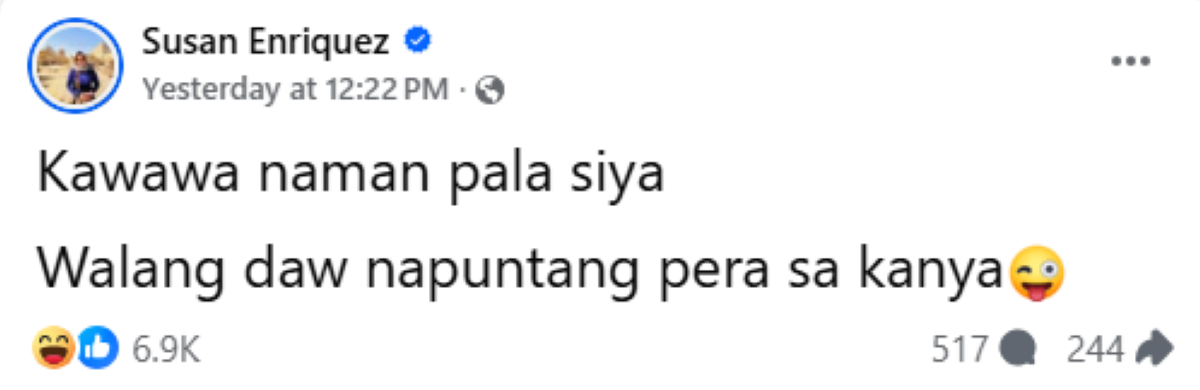 At dahil verified FB account, na nangangahulugang posibleng si Susan talaga ang nasa likod ng post, naging usap-usapan ito at nagngitngit din sa galit ang mga netizen na nag-react sa kaniyang post.