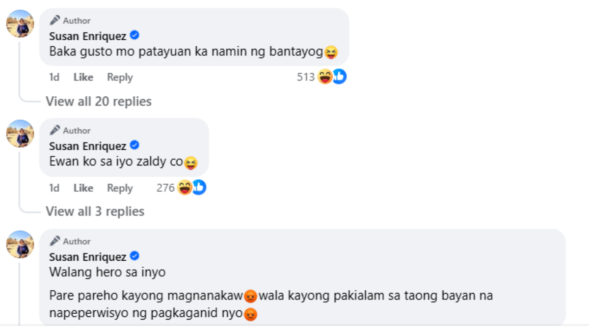 "Walang hero sa inyo. Pare-pareho kayong magnanakaw, wala kayong pakialam sa taong bayan na napeperwisyo ng pagkaganid n’yo," aniya pa na mababasa na sa comment section ng kaniyang post.