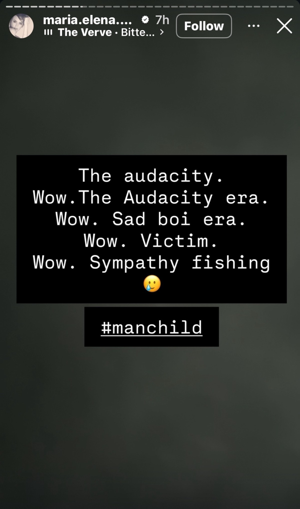 “The audacity. Wow. The audacity era. Wow, sad boi era. Wow. Victim. Wow. Sympathy fishing. #manchild," mababasa sa text caption ng isa sa mga Instagram story ni Ellen.