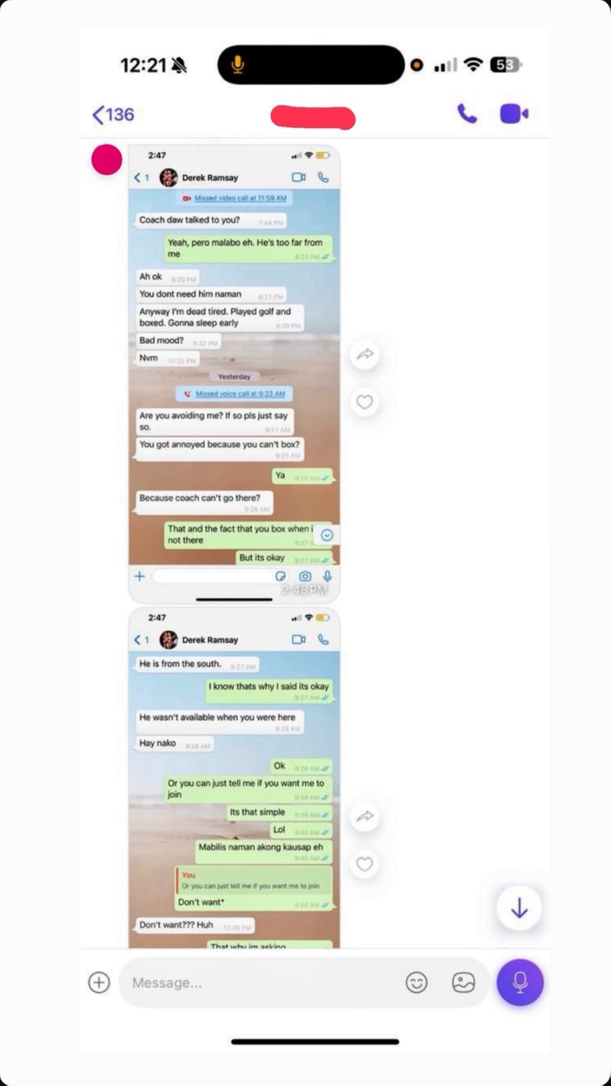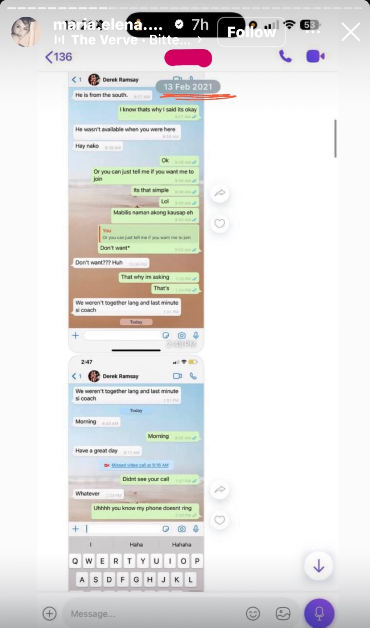 Batay sa mga sunod-sunod na screenshots na pinakawalan ni Ellen, mahihinuhang may iba umanong babae o "side chick" na kausap si Derek kahit na naging opisyal na silang magkasintahan noong Pebrero 9, 2021.
