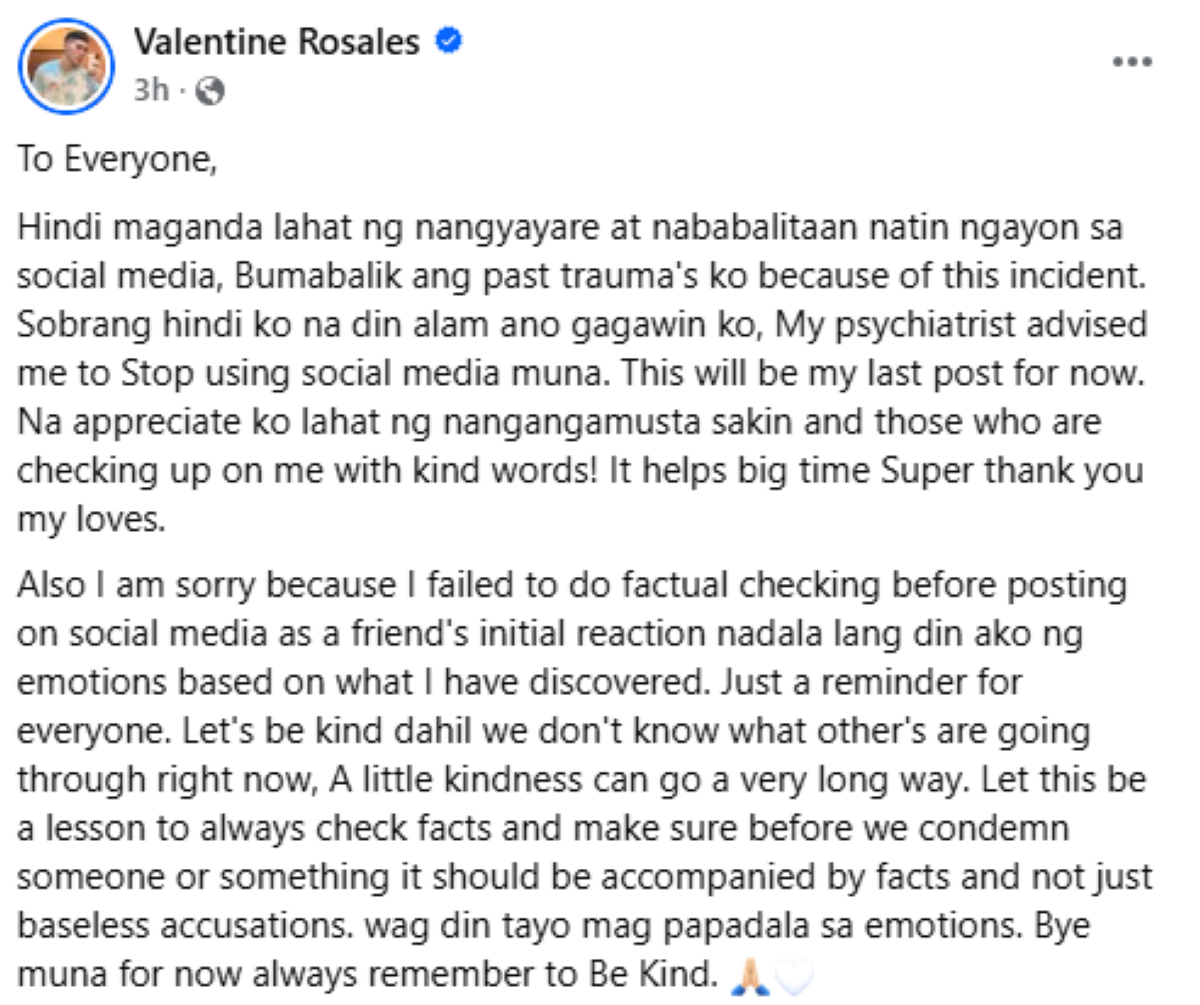 "Also I am sorry because I failed to do factual checking before posting on social media as a friend's initial reaction nadala lang din ako ng emotions based on what I have discovered."