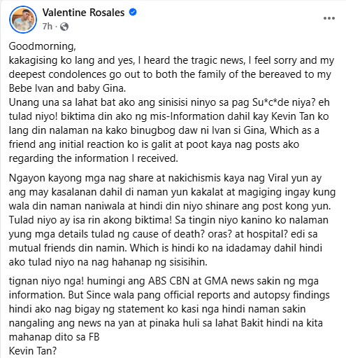 "Unang una sa lahat bat ako ang sinisisi ninyo sa pag Su*c*de niya? eh tulad niyo! biktima din ako ng mis-Information dahil kay Kevin Tan ko lang din nalaman na kako binugbog daw ni Ivan si Gina, Which as a friend ang initial reaction ko is galit at poot kaya nag posts ako regarding the information I received."
