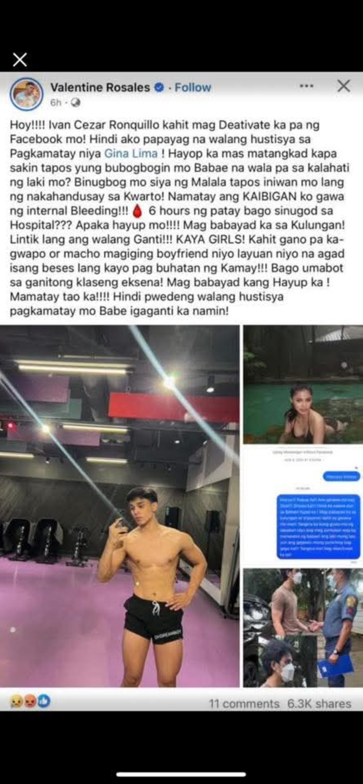 “Hoy!!!! Ivan Cezar Ronquillo kahit mag Deativate ka pa ng Facebook mo! Hindi ako papayag na walang hustisya sa Pagkamatay niya Gina Lima! Hayop ka mas matangkad kapa sakin tapos yung bubogbogin mo Babae na wala pa sa kalahati ng laki mo?” saad ni Valentine sa kaniyang Facebook post, as is published.