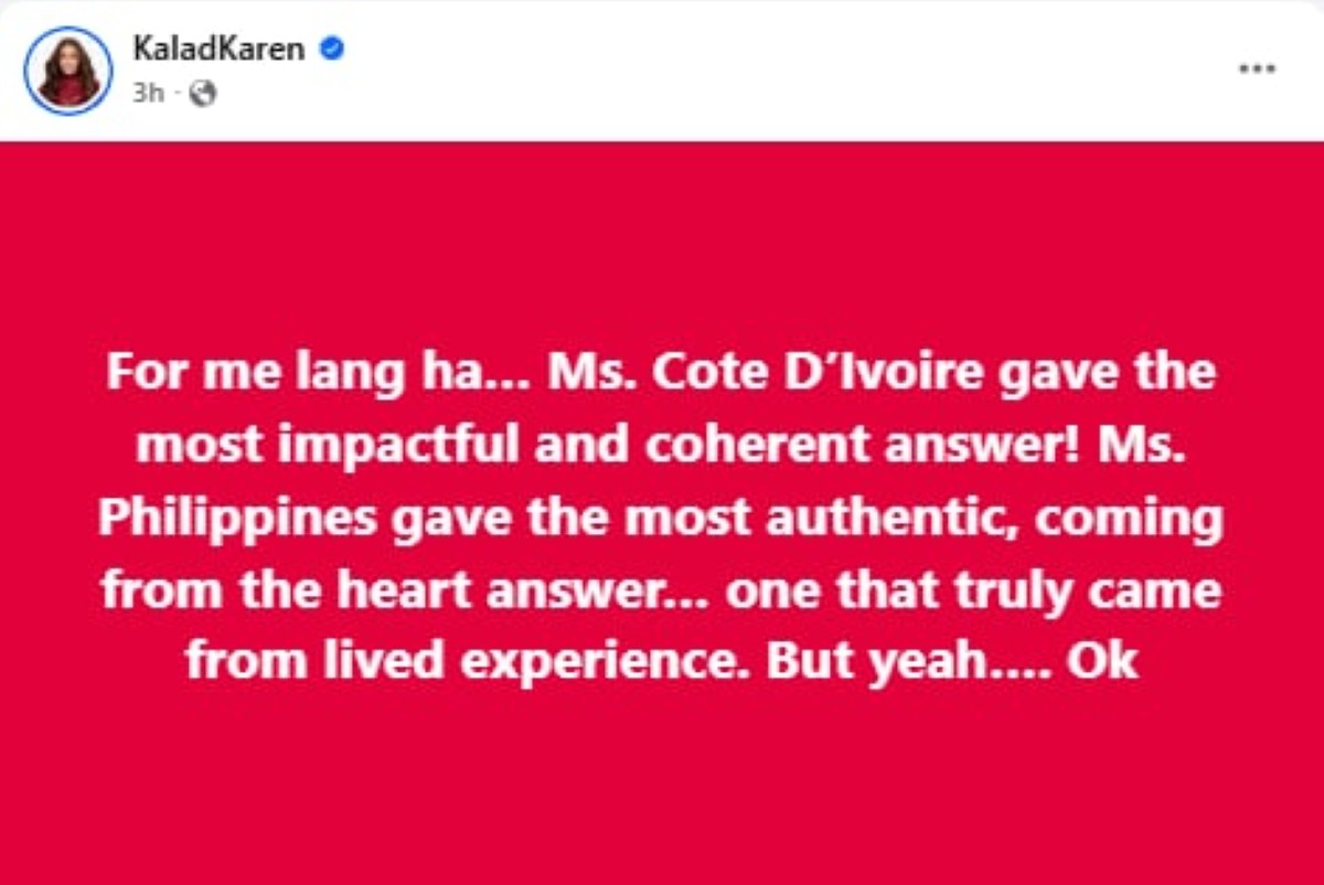 “For me lang ha… Ms. Cote D’Ivoire gave the most impactful and coherent answer!” pagpuri ni KaladKaren sa kandidata sa kaniyang Facebook post nitong Biyernes, Nobyembre 21.
