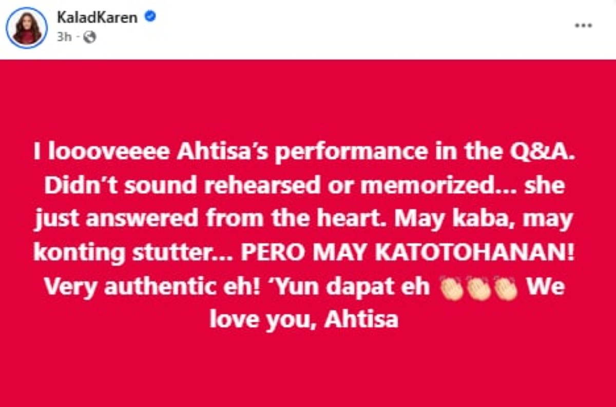 Sa hiwalay naman na post, pinuri pa ni KaladKaren ang performance ni Ahtisa sa Q&A. Aniya, bagama’t kinabahan, mula sa puso at may katotohanan daw ang naging sagot nito.