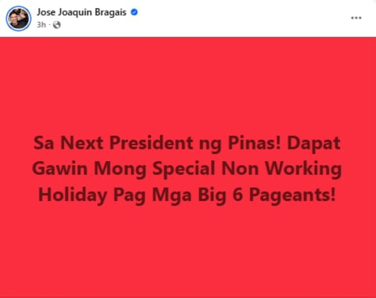 “Sa Next President ng Pinas! Dapat Gawin Mong Special Non Working Holiday Pag Mga Big 6 Pageants!” saad ni Jojo sa kaniyang post.