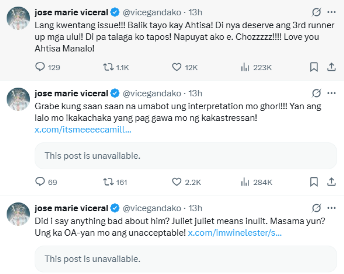 "Lang kwentang issue!!! Balik tayo kay Ahtisa! Di nya deserve ang 3rd runner up mga ulul! Di pa talaga ko tapos! Napuyat ako e. Chozzzzz!!!! Love you Ahtisa Manalo!" aniya pa.