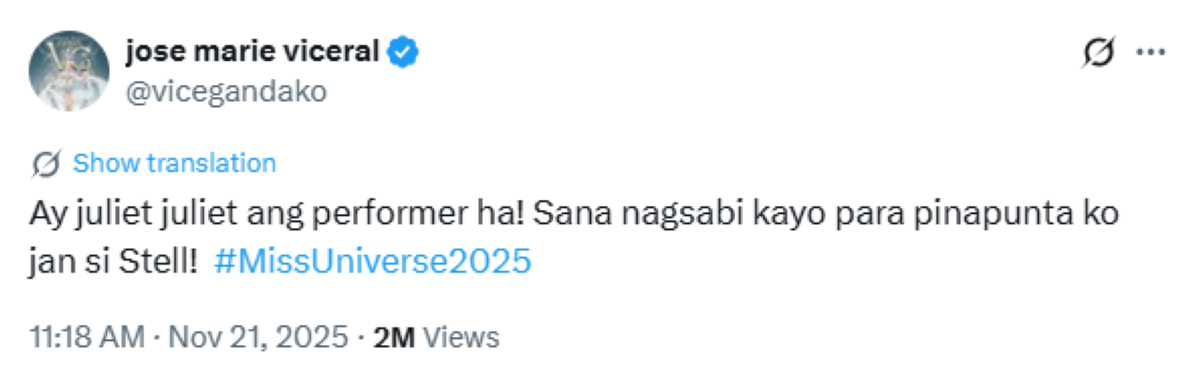 Biro niya, “Ay juliet juliet ang performer ha! Sana nagsabi kayo para pinapunta ko jan si Stell!”—na tumutukoy sa miyembro ng P-Pop group na SB19.