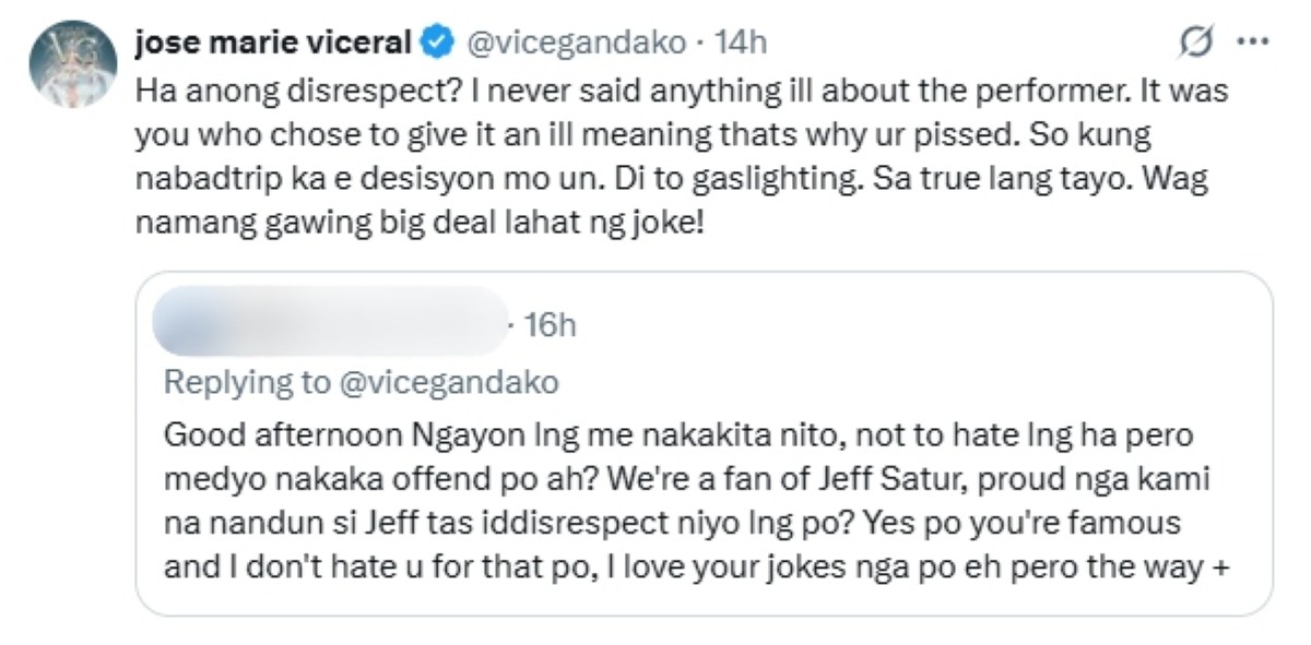 "Ha anong disrespect? I never said anything ill about the performer. It was you who chose to give it an ill meaning thats why ur pissed. So kung nabadtrip ka e desisyon mo un. Di to gaslighting. Sa true lang tayo. Wag namang gawing big deal lahat ng joke!" aniya.