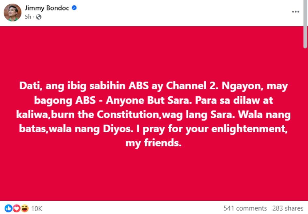 Kaya naman palagay ni Bondoc, "Dati, ang ibig sabihin ABS ay Channel 2. Ngayon, may bagong ABS - Anyone But Sara. Para sa dilaw at kaliwa,burn the Constitution,wag lang Sara. Wala nang batas,wala nang Diyos. I pray for your enlightenment, my friends."