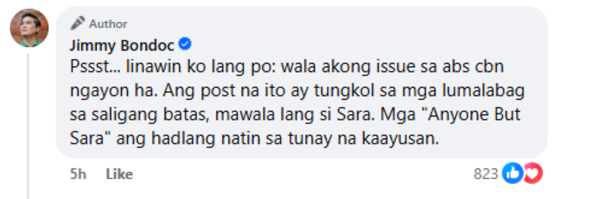 "Pssst... linawin ko lang po: wala akong issue sa abs cbn ngayon ha. Ang post na ito ay tungkol sa mga lumalabag sa saligang batas, mawala lang si Sara. Mga 'Anyone But Sara' ang hadlang natin sa tunay na kaayusan," aniya pa.