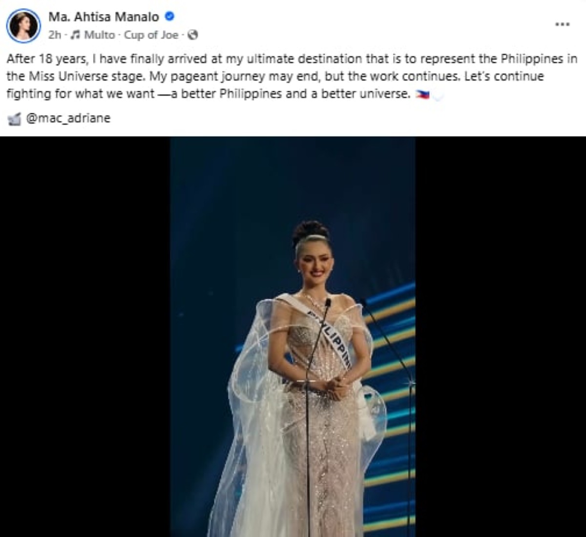 “My ultimate multo. Ma. Athisa Manalo, Miss Universe 2025”