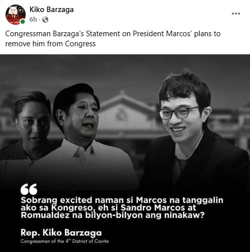 "Sobrang excited naman si Marcos na tanggalin ako sa Kongreso, eh si Sandro Marcos at Romualdez na bilyon-bilyon ang ninakaw?" pasaring na tanong niya.