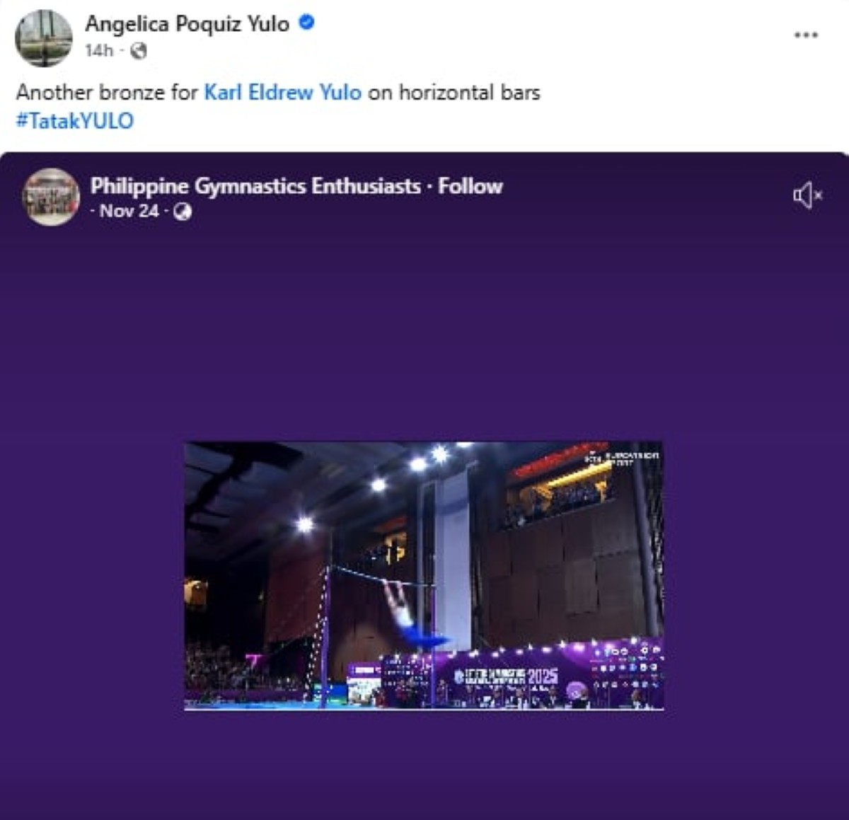 “Another bronze for Karl Eldrew Yulo on horizontal bars #TatakYULO,” saad ni Angelica sa kaniyang social media post noong Lunes ng gabi, Nobyembre 24.