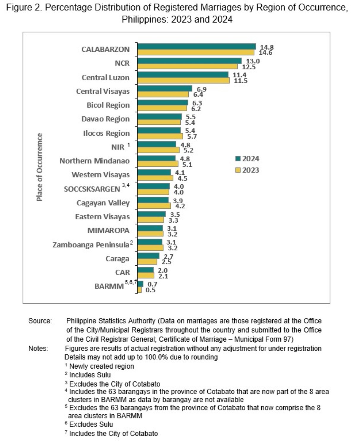 Sa kabilang banda, ang Bangsamoro Autonomous Region in Muslim Mindanao (BARMM) ang may pinakamababang bilang ng ikinakasal na may 2,629.