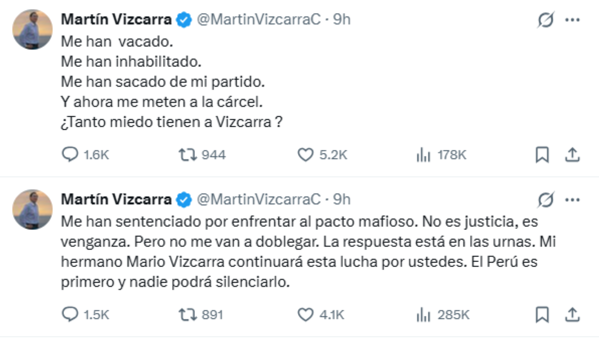 Salin nito sa Ingles, "I have been sentenced for confronting the mafia pact. This is not justice, it is revenge. But they will not break me. The answer lies in the ballot box. My brother, Mario Vizcarra, will continue this fight for you. Peru comes first, and no one will be able to silence it.”