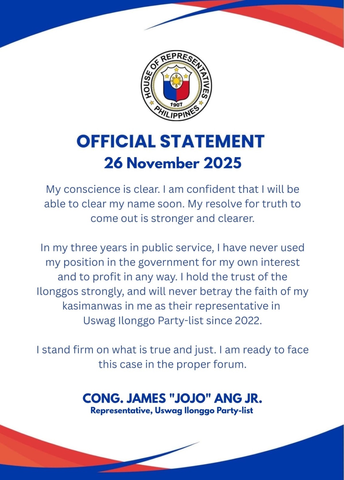 “My conscience is clear. I am confident that I will be able to clear my name soon. My resolve for truth to come out is stronger and clearer,” saad ni Cong. Ang Jr. sa ibinahaging social media post ng Uswag Ilonggo Partylist noong Miyerkules, Nobyembre 26.