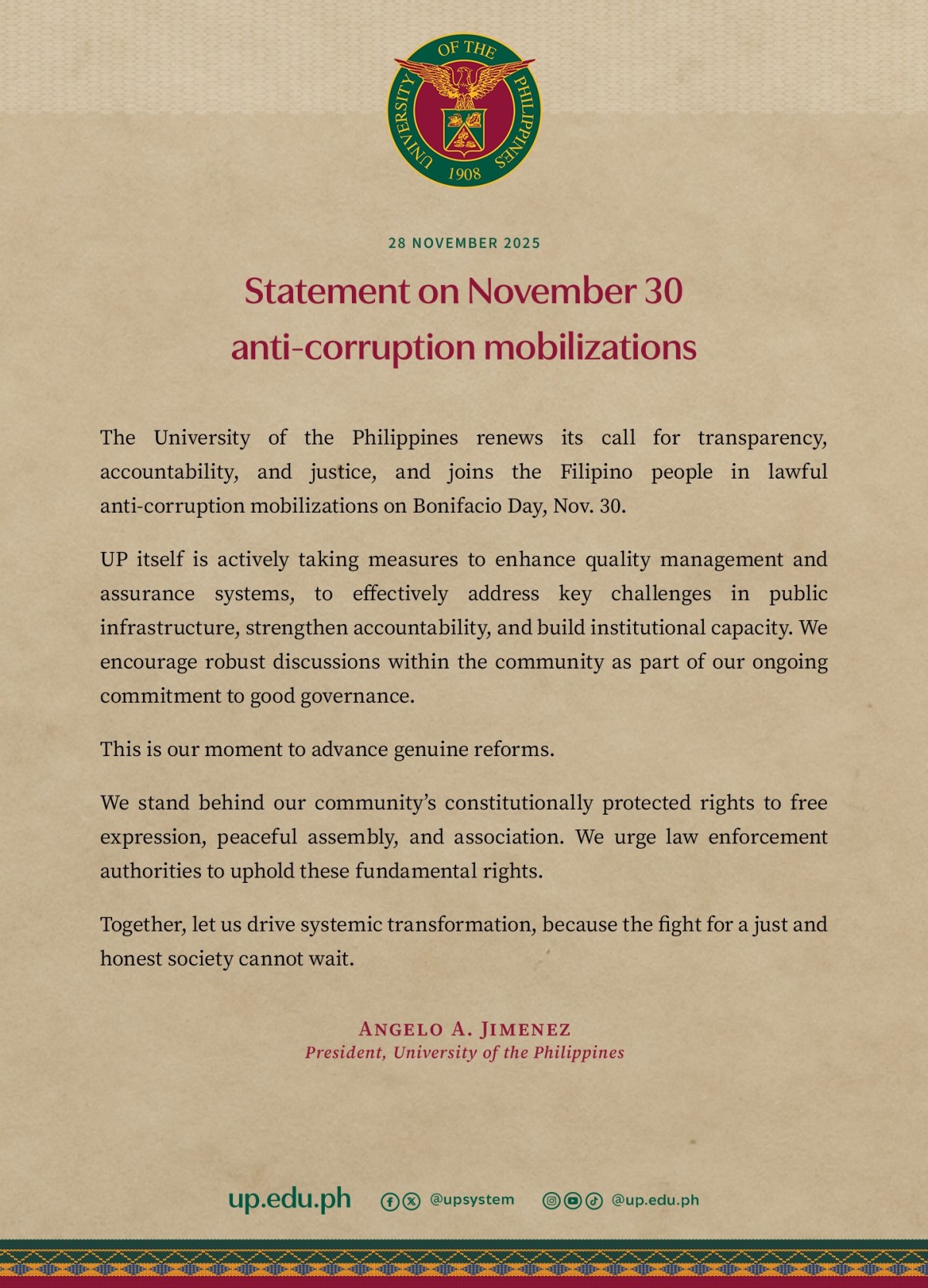 “The University of the Philippines renews its call for transparency, accountability, and justice, and joins the Filipino people in lawful anti-corruption mobilizations on Bonifacio Day, Nov. 30,” panimula ng UP.