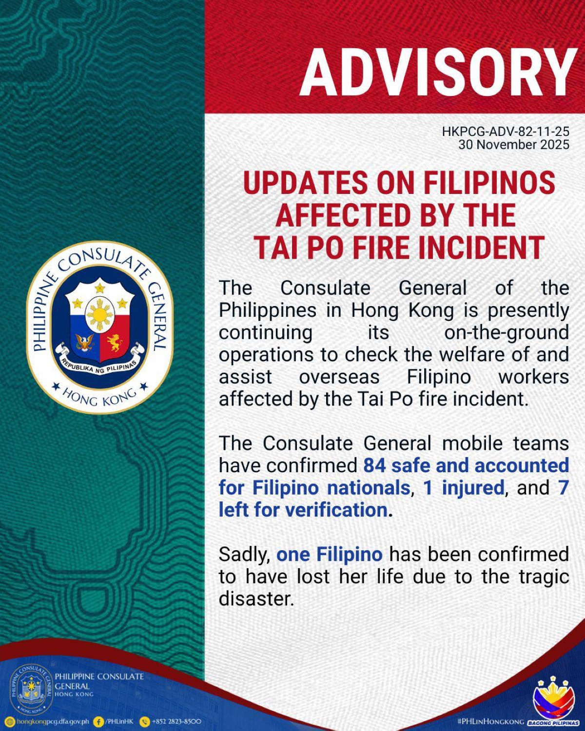 Gayunpaman, malungkot ding ibinalita ng Consulate na isang Pinay ang pumanaw sa insidente.