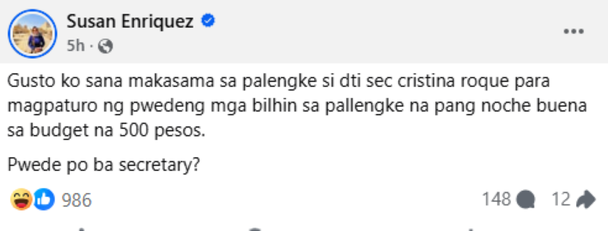 Sa Facebook post ni Enriquez nitong Lunes, Disyembre 1, tila may hirit si Enriquez kay Roque tungkol sa pagsama niya ritong mamalengke para magpaturo sa tamang pagba-budget, para mapagkasya ang nabanggit na halaga ng pera para makabili ng mga ihahanda sa Noche Buena, sa gabi ng Pasko.