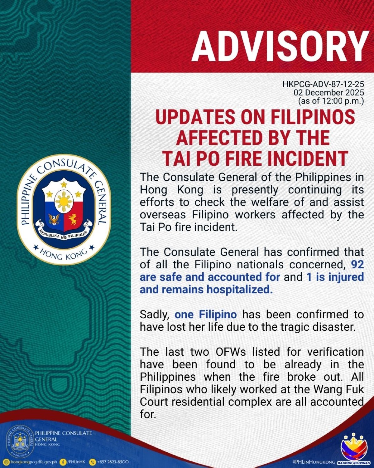 Kinumpirma ng Philippine Consulate General sa Hong Kong na 92 OFWs (Overseas Filipino Workers) na ang kasalukuyang ligtas matapos ang naging malaking sunog sa Wang Fuk Court kamakailan.