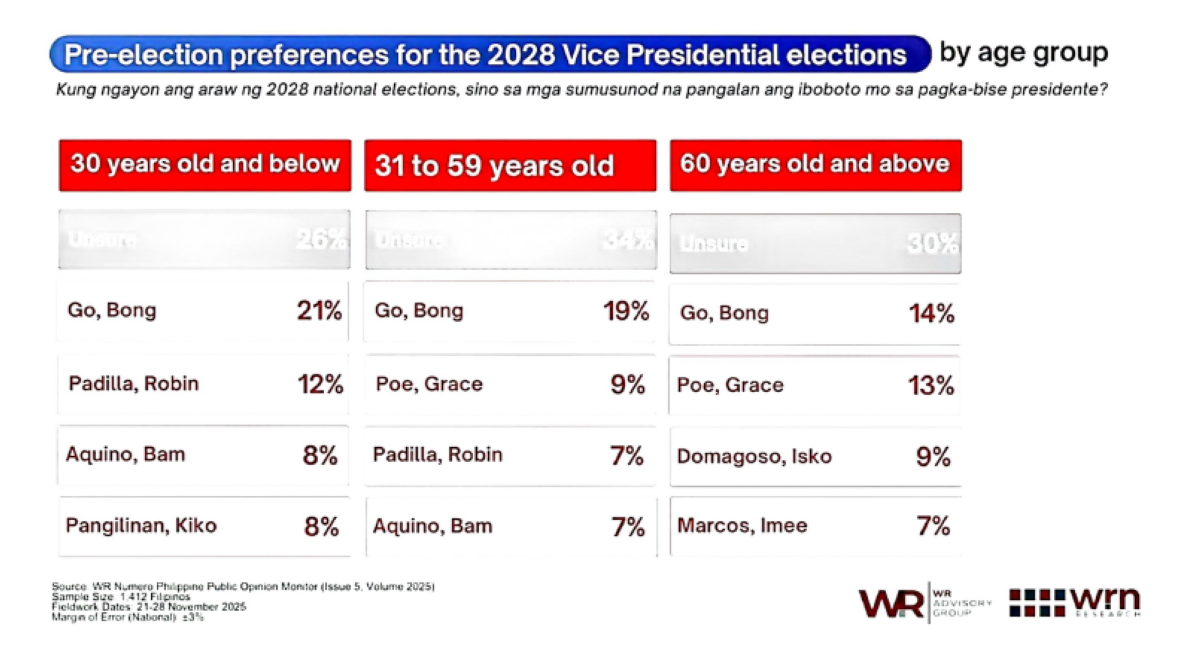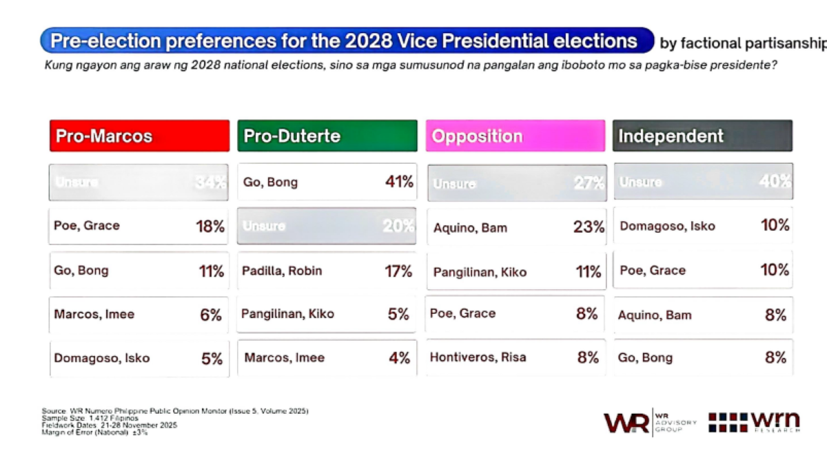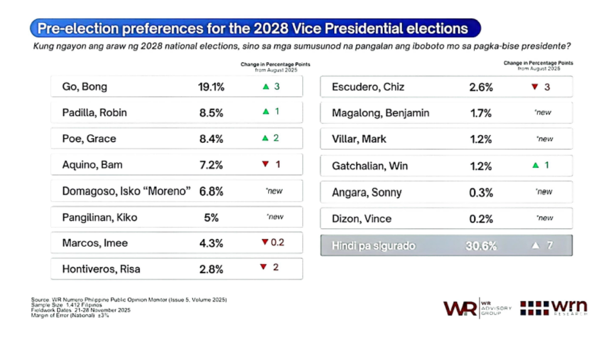 Sinagot ng respondents ang tanong na "Kung ngayon ang araw ng 2028 national elections, sino sa mga sumusunod na pangalan ang iboboto mo sa pagka-bise presidente?"