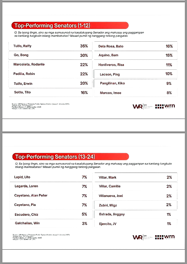 Nangunguna bilang top-performing senator si Senador Raffy Tulfo, base sa latest survey ng WR Numero.