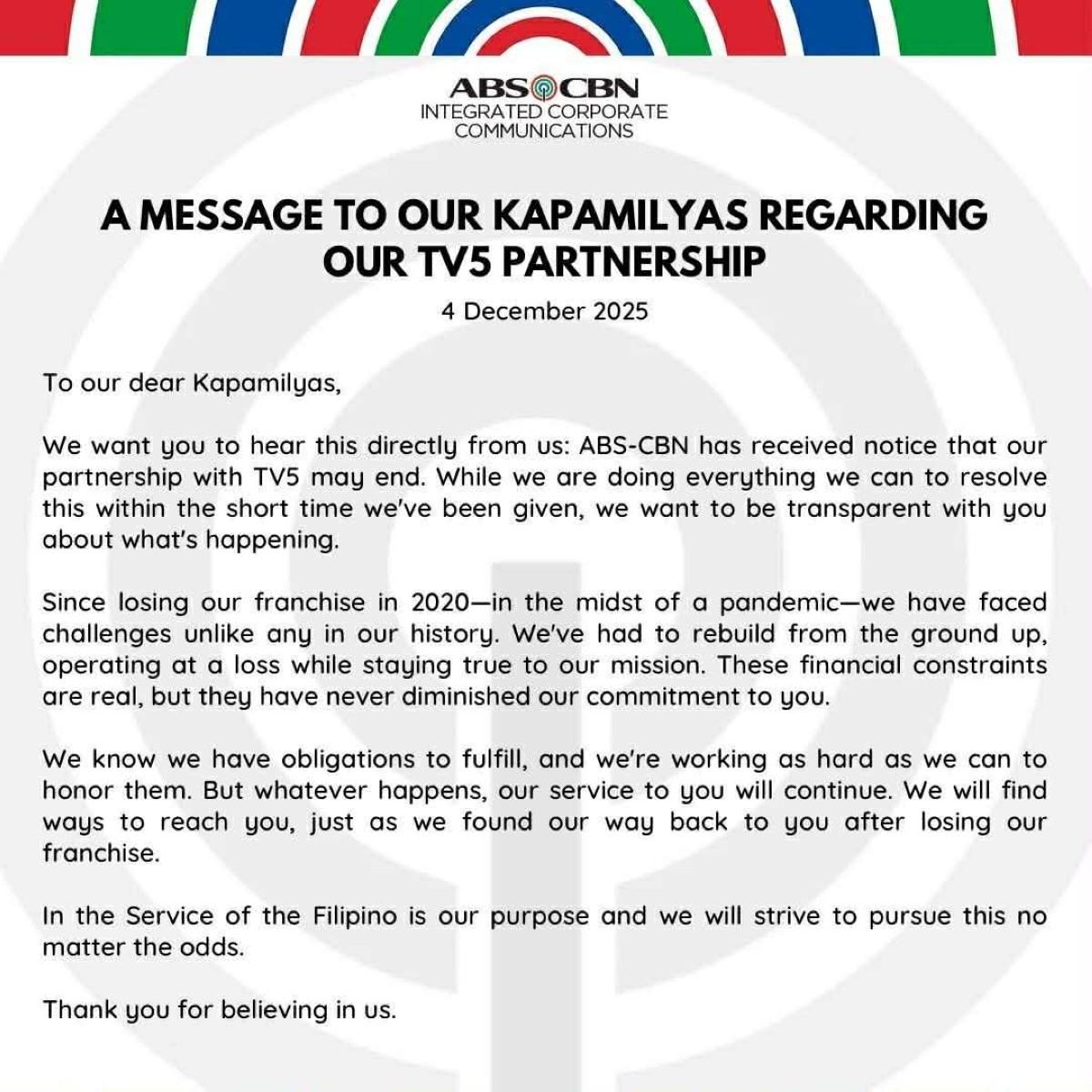 “In the Service of the Filipino is our purpose, and we will strive to pursue this no matter the odds. Thank you for believing in us,” pagtatapos ng ABS-CBN.