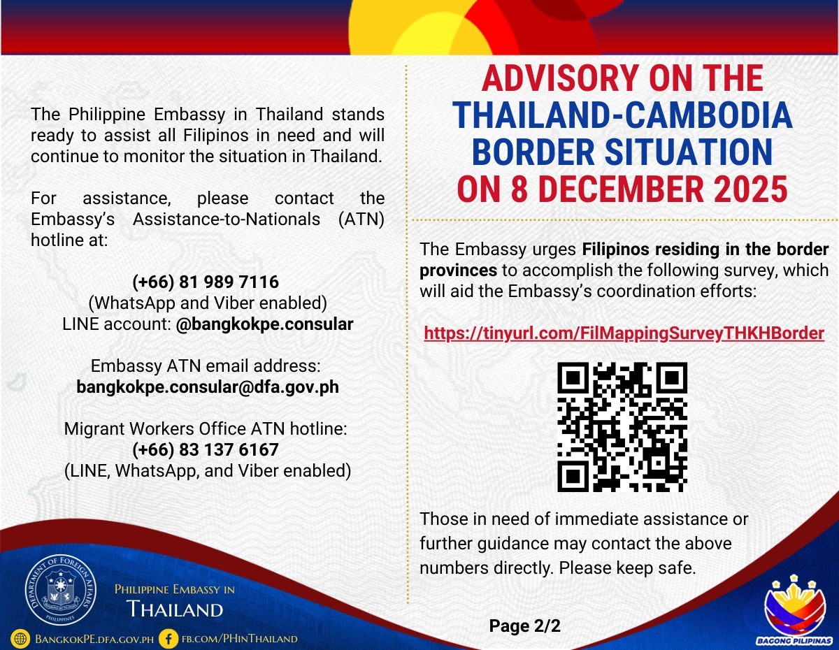 “In view of the ongoing armed clashes at various locations along the Thai - Cambodian border on 8 December 2025, the Philippine Embassy in Thailand urgently advises members of the Filipino community in the border provinces of Ubon Ratchatani, Si Sa Ket, Surin, Sa Kaeo, Buri Ram, Chantaburi, and Trat to earnestly follow the advice, including any evacuation orders, from local public safety and community officials, their employers, and other pertinent authorities in the affected areas,” saad nila.
