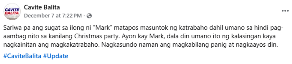 Mababasa sa post, "Sariwa pa ang sugat sa ilong ni 'Mark' matapos masuntok ng katrabaho dahil umano sa hindi pag-aambag nito sa kanilang Christmas party. Ayon kay Mark, dala din umano ito ng kalasingan kaya nagkainitan ang magkakatrabaho. Nagkasundo naman ang magkabilang panig at nagkaayos din."