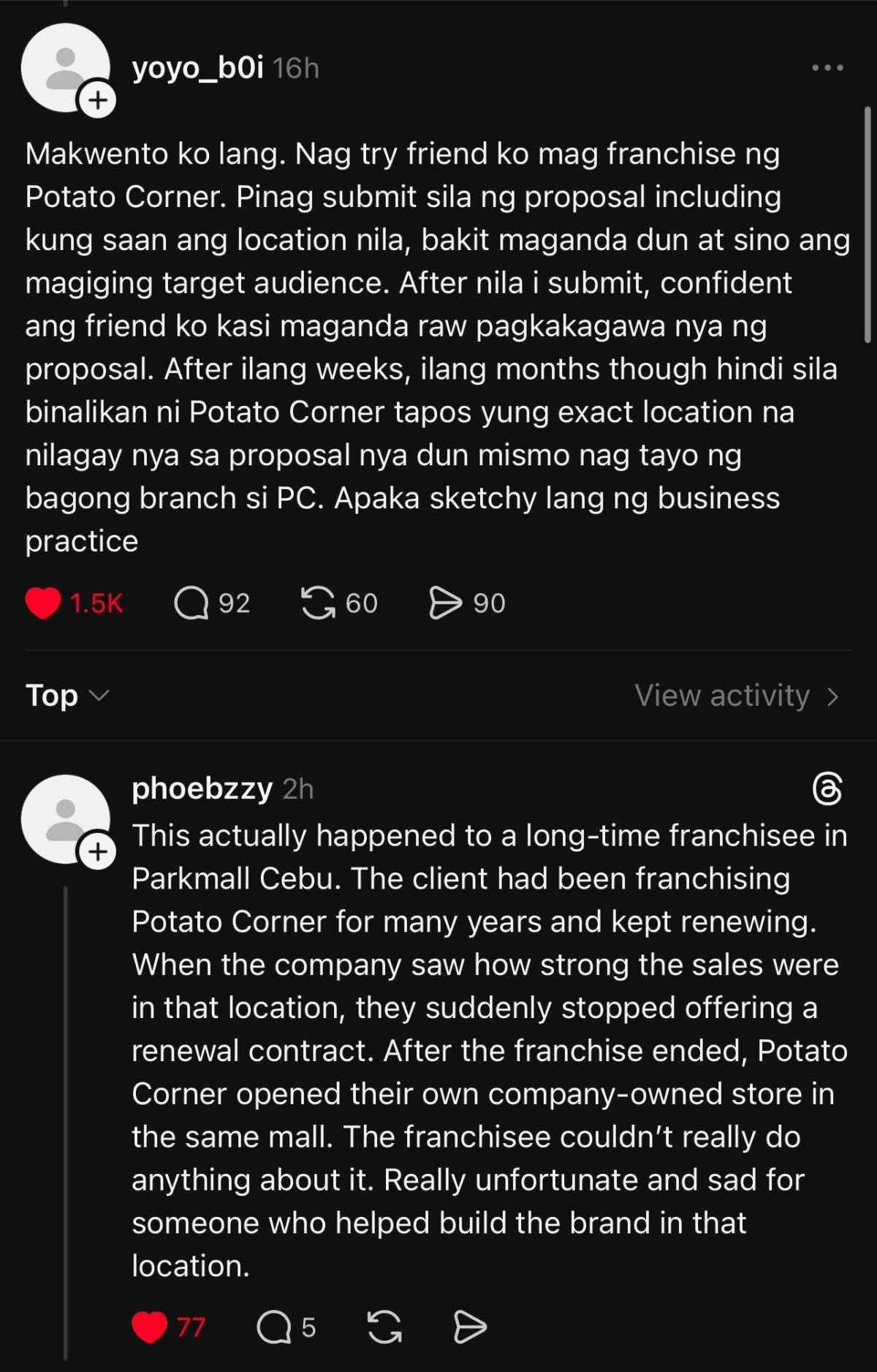 Ganito rin halos ang kuwento ng isang pang Thread user na nagkomento sa post ni "yoyo_b0i." Aniya, may isang kliyente umano sa Parkmall Cebu na matagal nang franchisee ng nasabing french fries outlet.