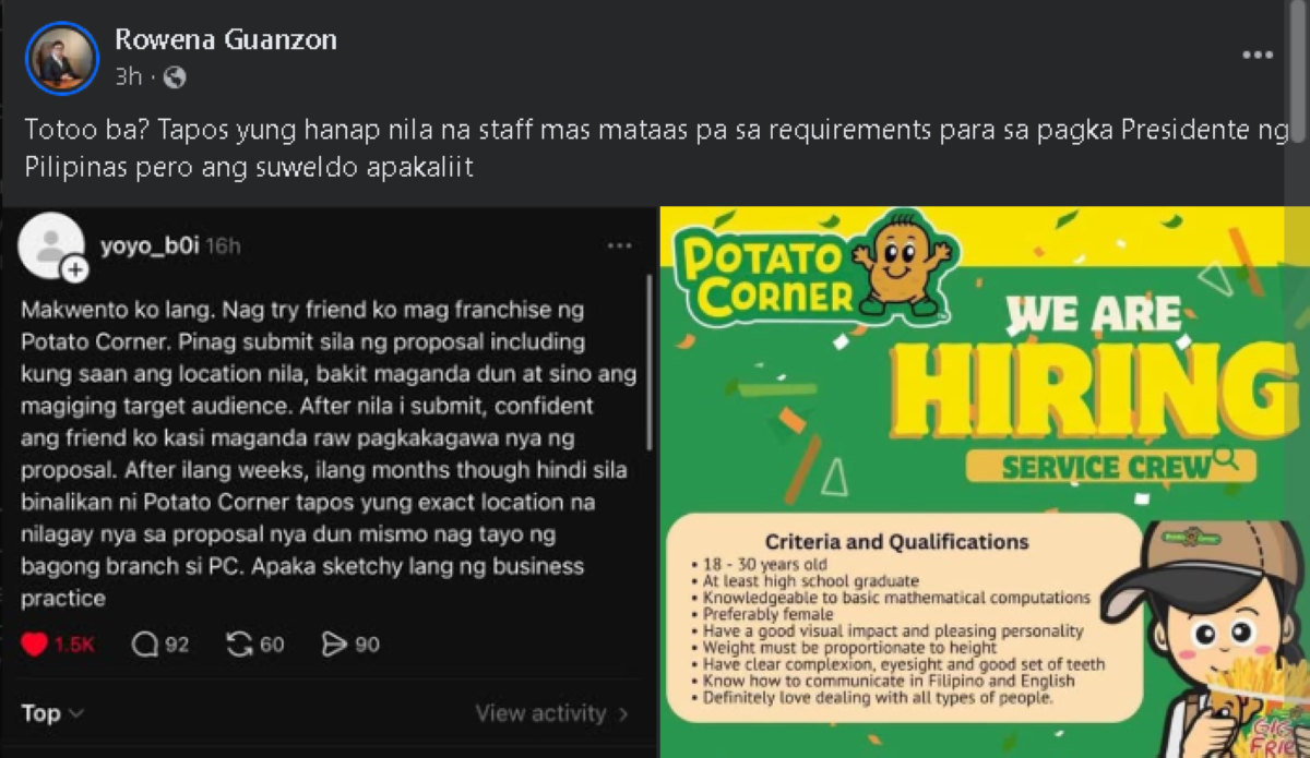 Matatandaang naging sentro din ng usapan ang Potato Corner noong 2023 dahil sa mataas na standard na hinahanap nito sa sa isang service crew.