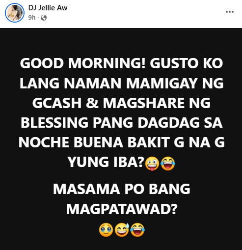 "GOOD MORNING! GUSTO KO LANG NAMAN MAMIGAY NG GCASH & MAGSHARE NG BLESSING PANG DAGDAG SA NOCHE BUENA BAKIT G NA G YUNG IBA? MASAMA PO BANG MAGPATAWAD?" aniya pa sa isa pang Facebook post.