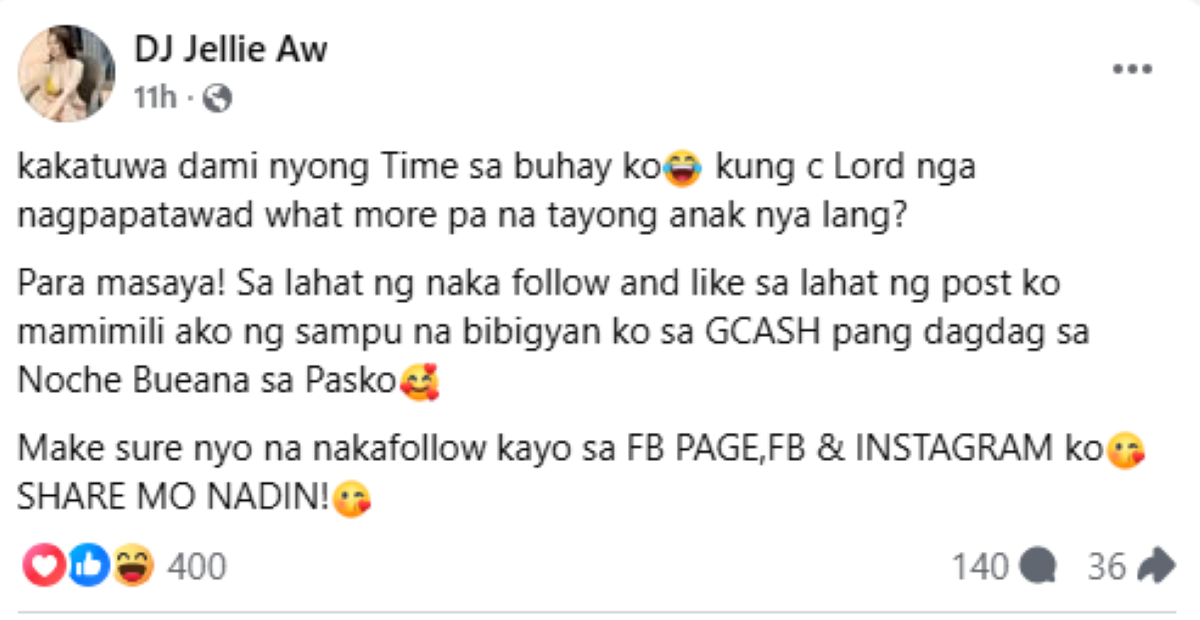 Mababasa, "kakatuwa dami nyong Time sa buhay ko kung c Lord nga nagpapatawad what more pa na tayong anak nya lang?"