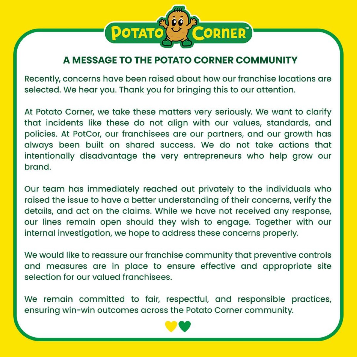 “While we have not received any response, our lines remain open should they wish to engage. Together with our internal investigation, we hope to address these concerns properly, dugtong pa ng Potato Corner.
