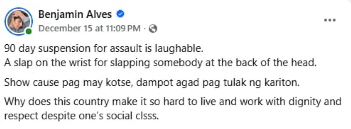 Sa isang social media post na ibinahagi ni Benjamin kamakailan, tahasan niyang sinabi na “katawa-tawa” ang ipinataw na suspensyon sa naturang drayber.