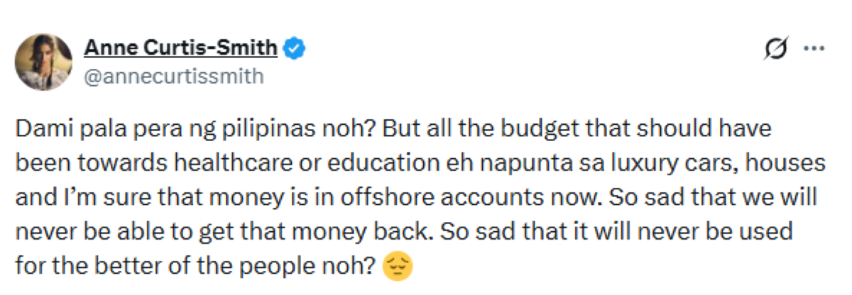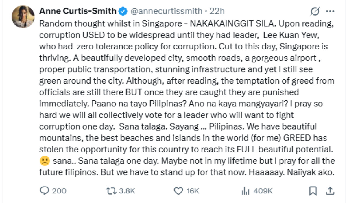 Mababasa sa X post ni Anne noong MIyerkules, Disyembre 17, na tila kinainggitan ni Anne ang naging paraan ng pamahalaan ng Singapore kung paano nila pinananagot ang mga opisyal ng pamahalaang napatunayang kurakot o nagsagawa ng katiwalian habang sila ay nakaposisyon.