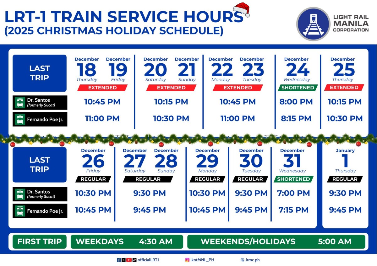 Ang mga sumusunod na schedule ang iimplementa ng LRMC mula Huwebes, Disyembre 18 hanggang araw ng bagong taon, Huwebes, Enero 1, 2026: