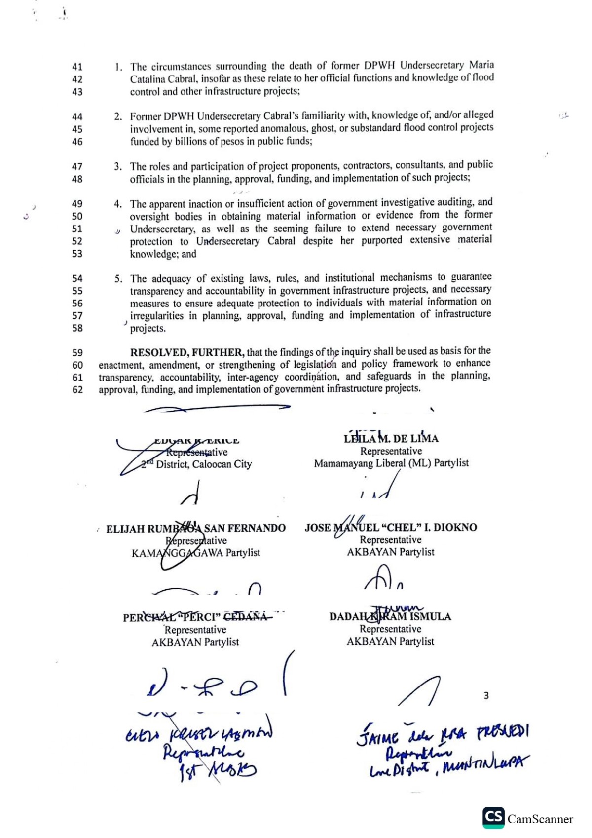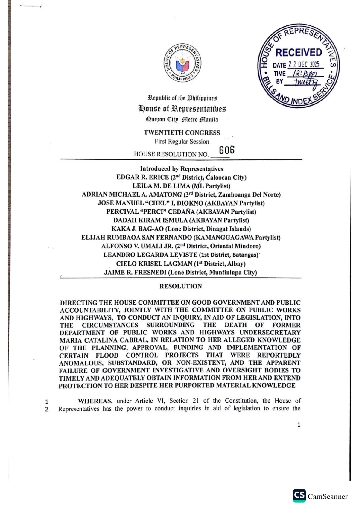 Isinapubliko ng House of the Representatives ang House Resolution No. 606 na natanggap nila mula sa mga mambabatas na umapelang paimbestigahan pa ang pagkamatay ni dating Department of Public Works and Highways (DPWH) Usec. Catalina Cabral.