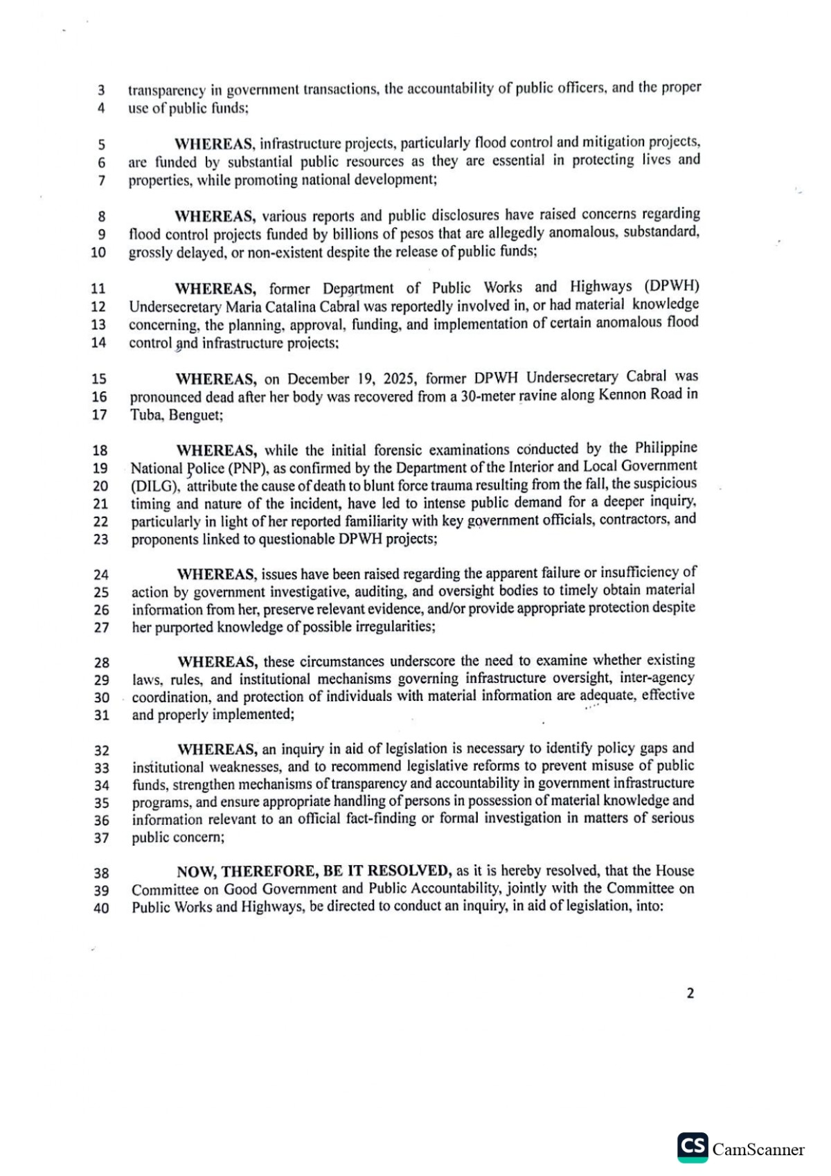 Ayon sa dokumentong ipinasa ng mga mambabatas, dapat daw na mabigyang linaw ang epekto ng pagkamatay ni Cabral bilang naging opisyal na may naging malaking gampanin at kaalaman kaugnay sa flood control projects at iba pang government infrastructure programs.
