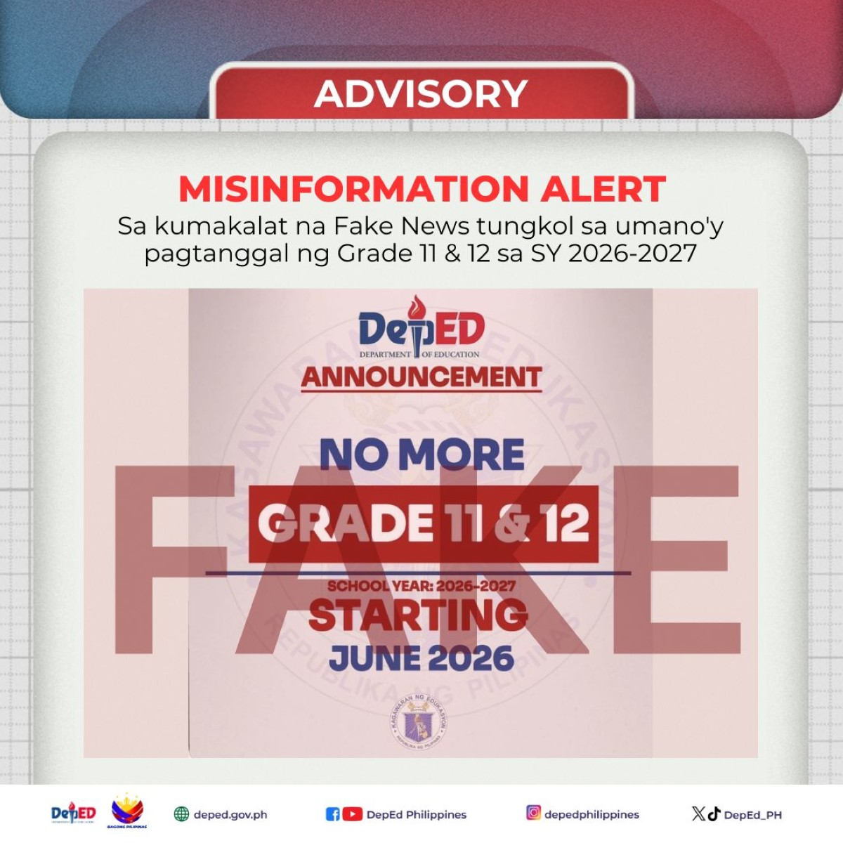 âKa-DepEd, walang katotohanan ang kumakalat na post sa social media tungkol sa umano'y pagtanggal ng Grade 11 at 12 para sa School Year 2026-2027,â panimula ng DepEd.