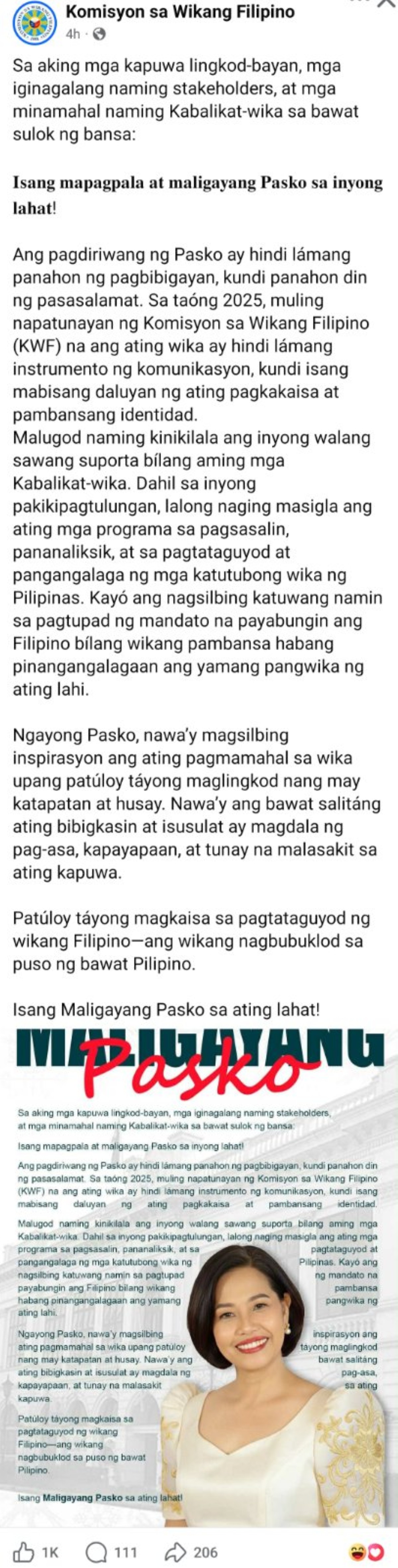 “Ngayong Pasko, nawa’y magsilbing inspirasyon ang ating pagmamahal sa wika upang patúloy táyong maglingkod nang may katapatan at husay,” saad ni Taran.