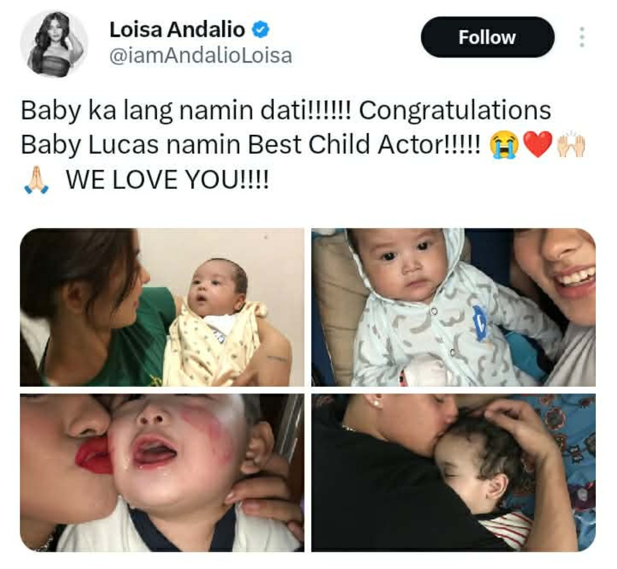 “Baby ka lang namin dati!!!!!! Congratulations Baby Lucas namin Best Child Actor!!!!!” WE LOVE YOU!” saad ni Loisa sa ibinahaging niyang social media post noong Sabado, Disyembre 28.