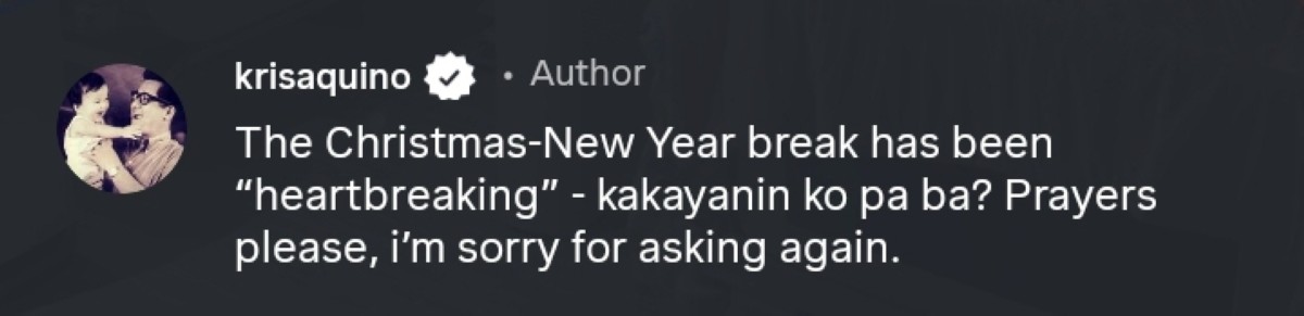 Sa isang emosyonal na pahayag na ibinahagi sa Instagram story, inilarawan ni Kris ang Christmas–New Year break bilang “heartbreaking,” at tahasang nagtanong, “Kakayanin ko pa ba?” habang humihingi ng dasal mula sa mga tagasuporta.