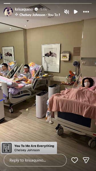 Kalakip ng Instagram story, makikitang nakaratay pa rin sa isang kama si Krissy kasama ang bunsong anak na si Bimby Aquino Yap, na parang may iniinda ring sakit.