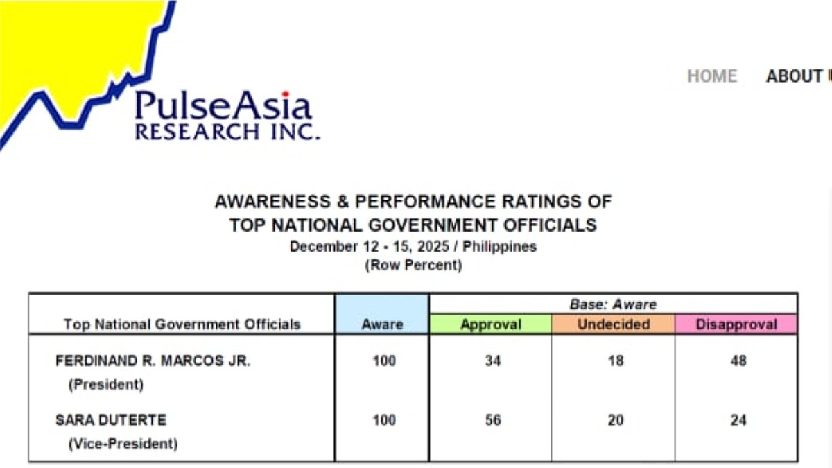Sa inilabas na resulta ng survey na ikinasa ng Pulse Asia mula Disyembre 12 hanggang 15, makikitang bahagyang umangat sa 34% ang “approval rating” ni PBBM, kumpara sa 33% niya noong Setyembre 2025.