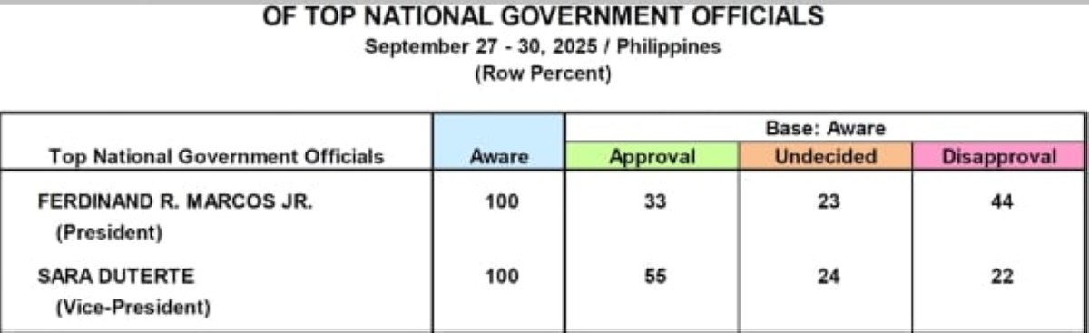 Umakyat naman sa 48% ang “disapproval rate” ng mga Pilipino sa Pangulo, mula sa 44% nito noong Setyembre 2025.Bahagya ring tumaas si VP Sara sa 24%, kumpara sa 22% nito sa parehong buwan.