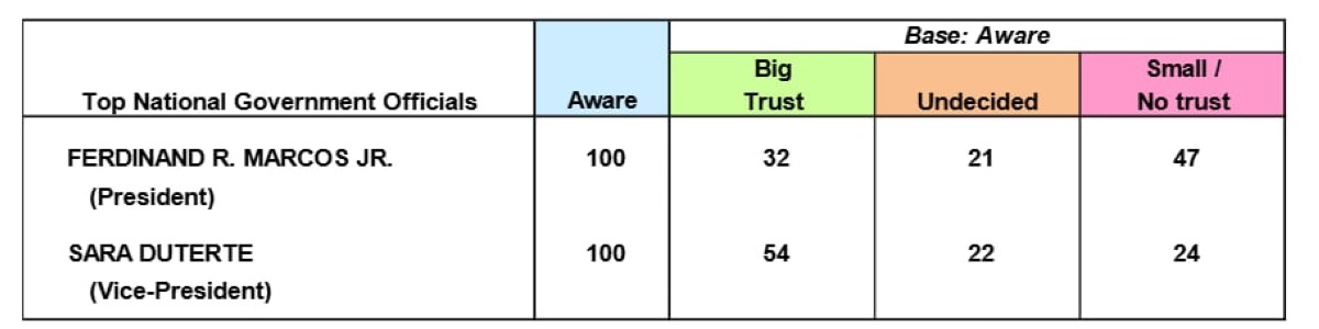 Nakakuha ng 32% “Big Trust” si PBBM, habang pumalo naman sa 47% ang kaniyang “Small/No Trust” rating.