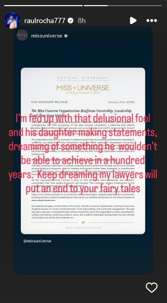 Makikita rin sa background ng kaniyang mensahe ang screenshot ng opisyal na pahayag ng MUO kaugnay ng isyung bumabalot sa umano’y pagmamay-ari at pamumuno sa prestihiyosong international beauty pageant.